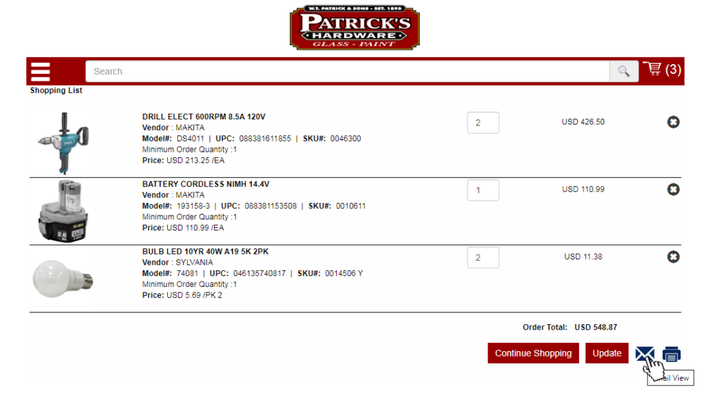 Once you have completed your list, either click the Envelope icon to send your order via email to Patrick’s Hardware or click the Print icon to print out your order and FAX it to 757-722-9001.
