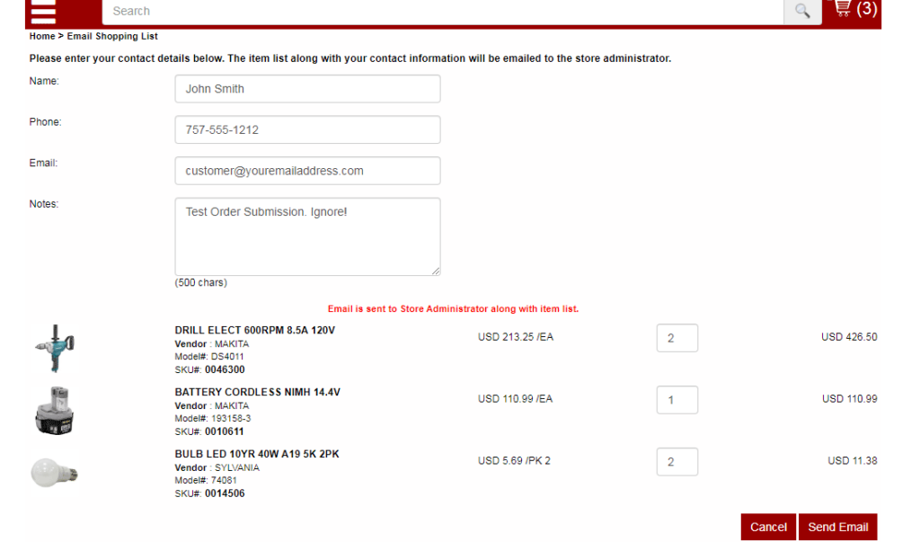 After clicking the Send Email button, you should see a red text notification saying “Email is sent to Store Administrator along with item list.” confirming that Patrick’s Hardware has received your order.